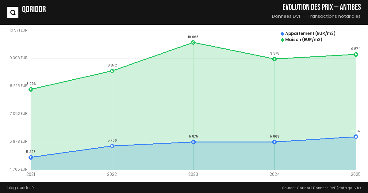 L'évolution des prix à Antibes dépend du quartier, du type de bien et de la conjoncture. Nos données, basées sur les transactions réelles enregistrées par les notaires, vous permettent de suivre les tendances récentes.