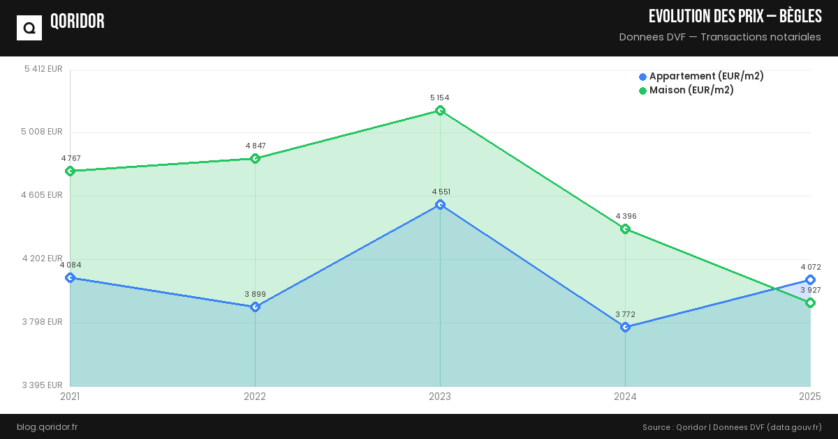 L'évolution des prix à Bègles dépend du quartier, du type de bien et de la conjoncture. Nos données, basées sur les transactions réelles enregistrées par les notaires, vous permettent de suivre les tendances récentes.