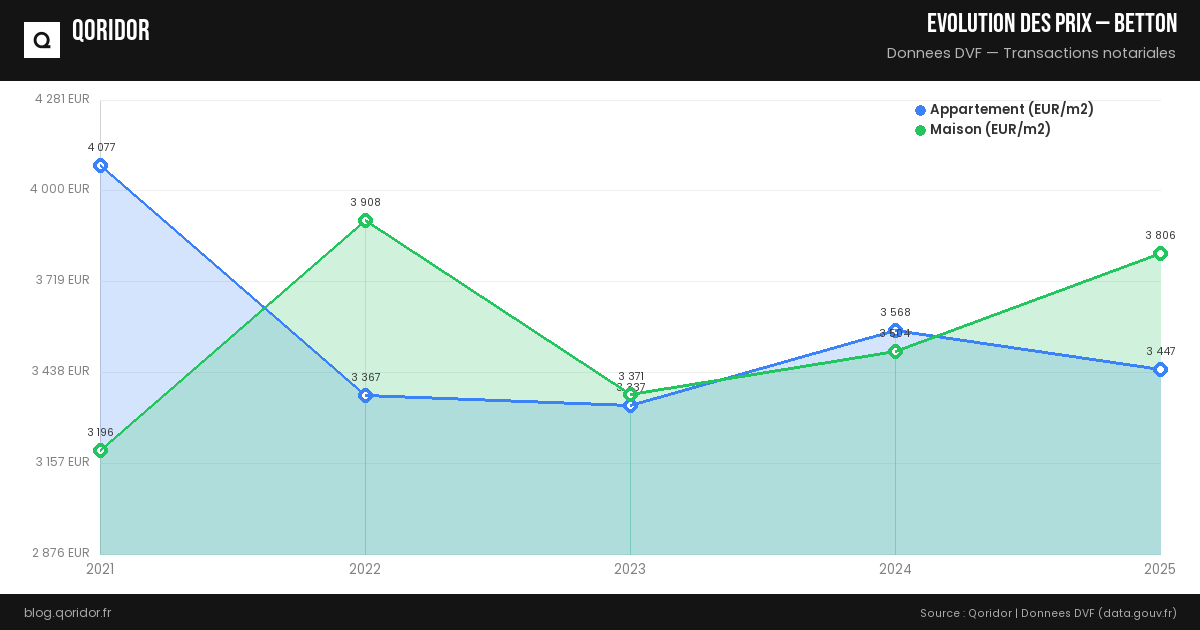 L'évolution des prix à Betton dépend du quartier, du type de bien et de la conjoncture. Nos données, basées sur les transactions réelles enregistrées par les notaires, vous permettent de suivre les tendances récentes.