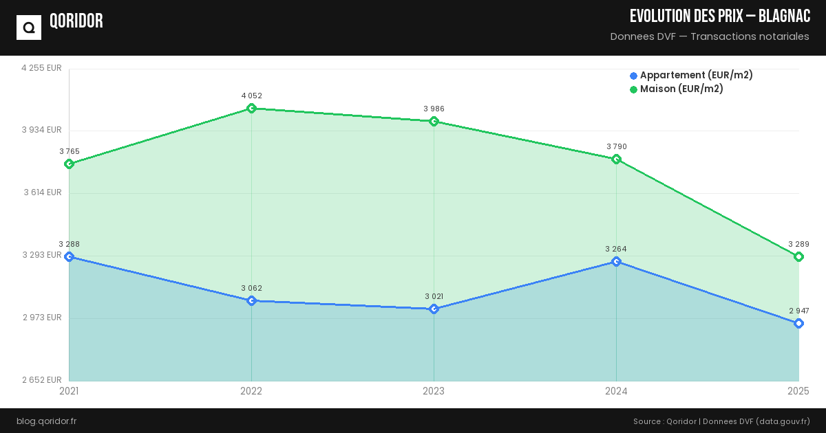 L'évolution des prix à Blagnac dépend du quartier, du type de bien et de la conjoncture. Nos données, basées sur les transactions réelles enregistrées par les notaires, vous permettent de suivre les tendances récentes.