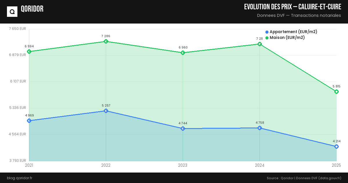 Le prix moyen au m² à Caluire-et-Cuire est parmi les plus élevés de la métropole lyonnaise hors Lyon intra-muros. La qualité de vie, les bords du Rhône et la proximité du 6e arrondissement de Lyon soutiennent les prix.