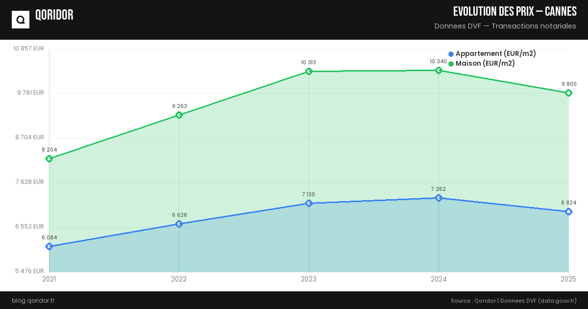 L'évolution des prix à Cannes dépend du quartier, du type de bien et de la conjoncture. Nos données, basées sur les transactions réelles enregistrées par les notaires, vous permettent de suivre les tendances récentes.
