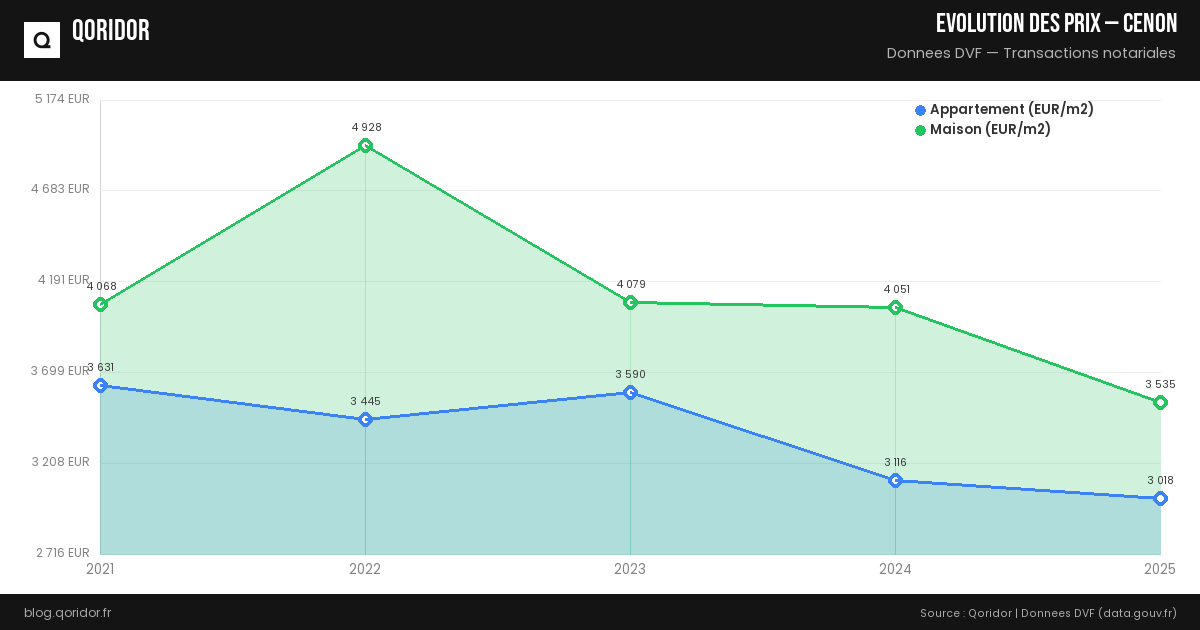 L'évolution des prix à Cenon dépend du quartier, du type de bien et de la conjoncture. Nos données, basées sur les transactions réelles enregistrées par les notaires, vous permettent de suivre les tendances récentes.