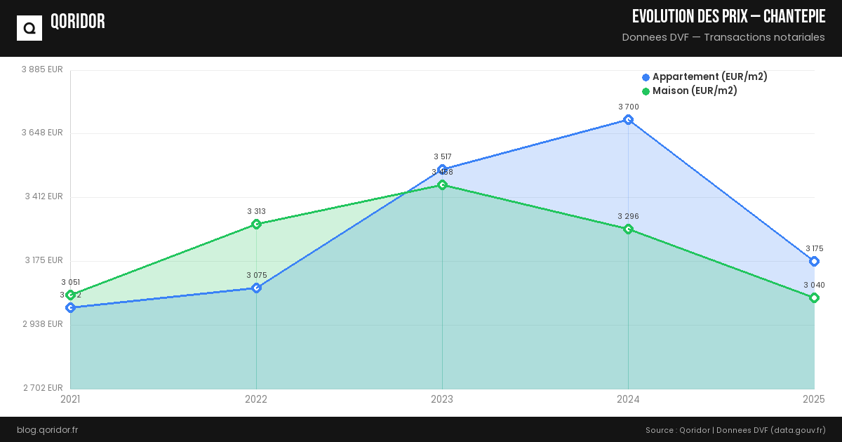 L'évolution des prix à Chantepie dépend du quartier, du type de bien et de la conjoncture. Nos données, basées sur les transactions réelles enregistrées par les notaires, vous permettent de suivre les tendances récentes.