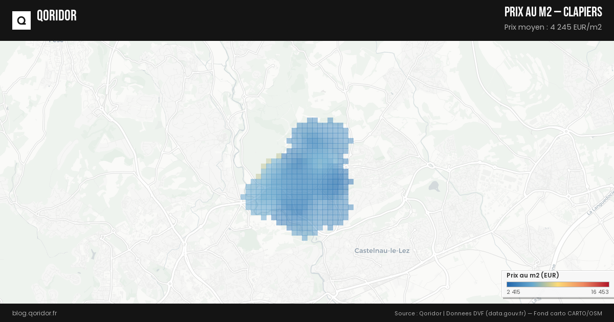 Le prix moyen au m² à Clapiers est supérieur à la moyenne des petites communes de la métropole montpelliéraine. Ce positionnement s'explique par la qualité de vie, le cadre naturel et la proximité de Montpellier et Castelnau-le-Lez.