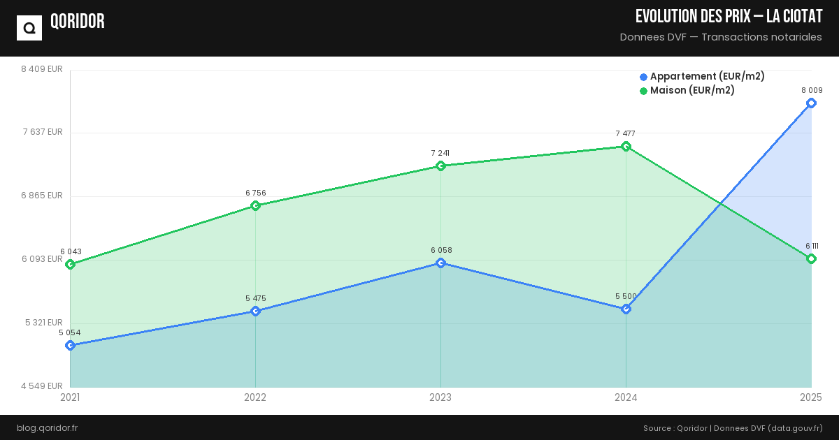 L'évolution des prix à La Ciotat dépend du quartier, du type de bien et de la conjoncture. Nos données, basées sur les transactions réelles enregistrées par les notaires, vous permettent de suivre les tendances récentes.