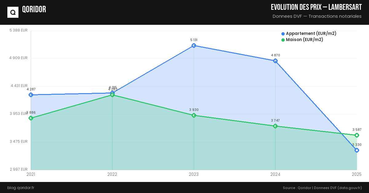 L'évolution des prix à Lambersart dépend du quartier, du type de bien et de la conjoncture. Nos données, basées sur les transactions réelles enregistrées par les notaires, vous permettent de suivre les tendances récentes.