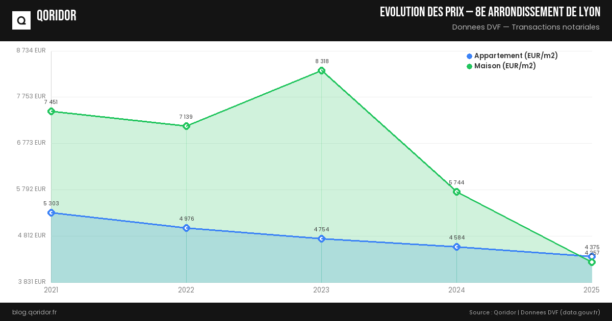 Le prix du m² pour une maison à 8e arrondissement de Lyon est estimé à 4 382 € en moyenne (soit +9.1 % par rapport aux appartements). Il peut varier entre 1 792 € et 6 403 € selon la localisation.