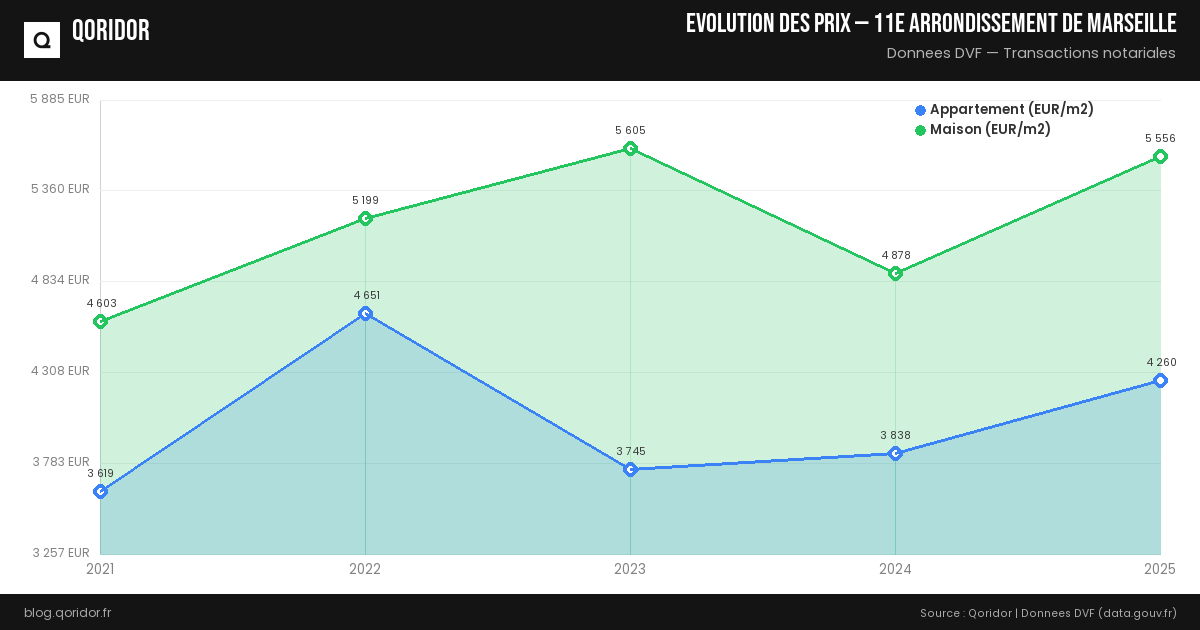Le prix du m² pour une maison à 11e arrondissement de Marseille est estimé à 4 720 € en moyenne (soit +51.4 % par rapport aux appartements). Il peut varier entre 2 689 € et 7 048 € selon la localisation.