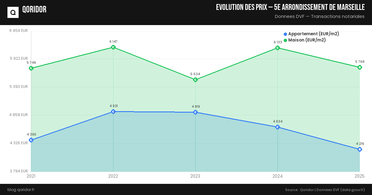 Le prix du m² pour une maison à 5e arrondissement de Marseille est estimé à 5 278 € en moyenne (soit +50.5 % par rapport aux appartements). Il peut varier entre 3 179 € et 7 973 € selon la localisation.