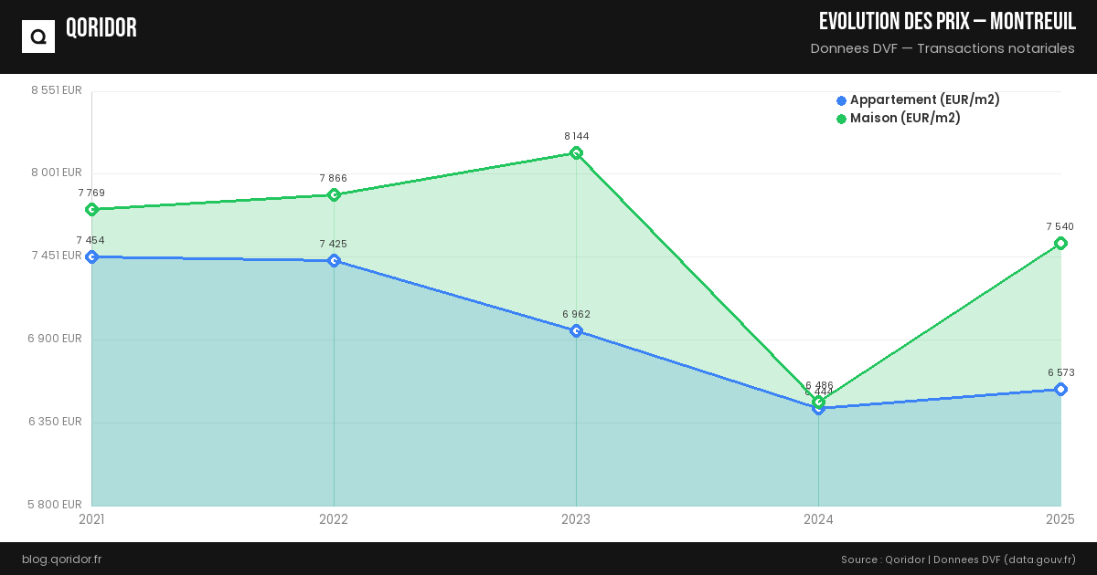 L'évolution des prix à Montreuil dépend du quartier, du type de bien et de la conjoncture. Nos données, basées sur les transactions réelles enregistrées par les notaires, vous permettent de suivre les tendances récentes.