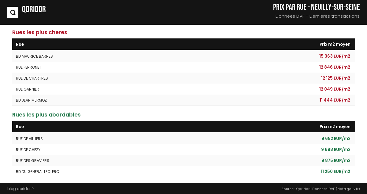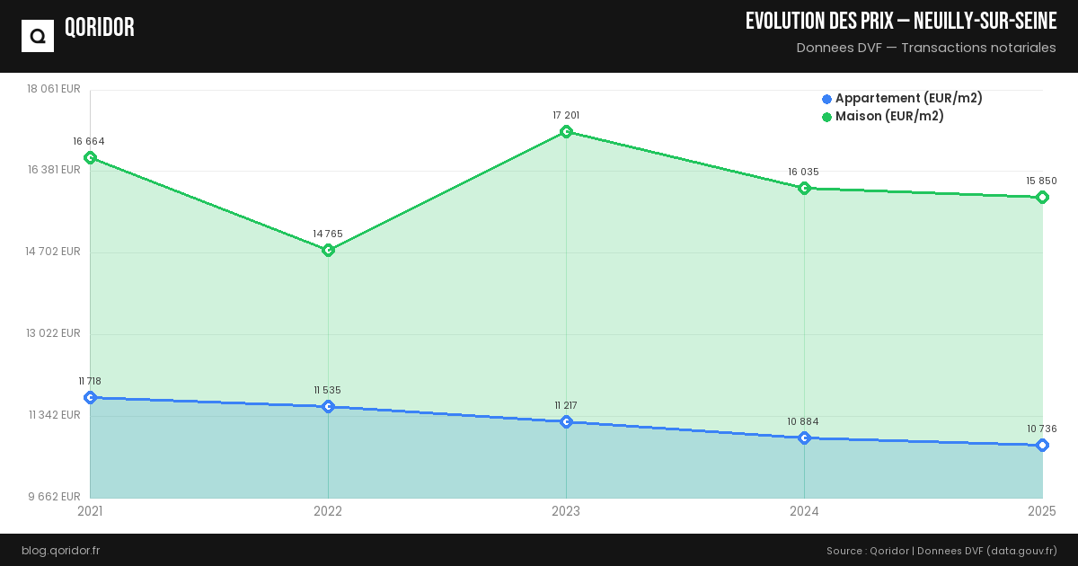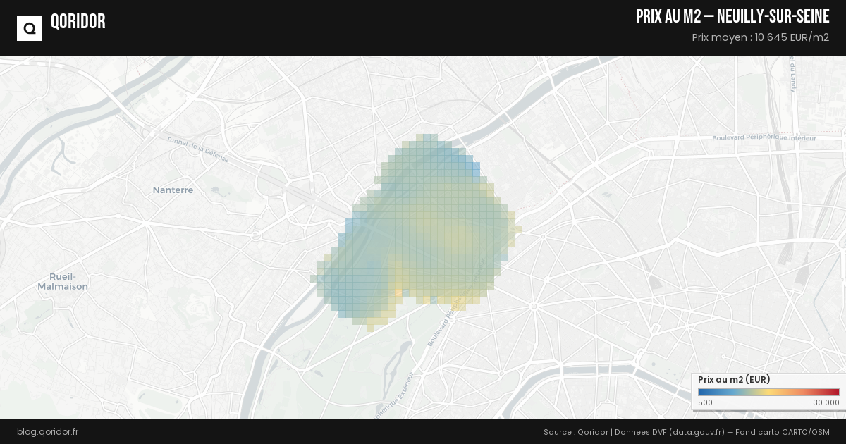 Le prix moyen au m² à Neuilly-sur-Seine est calculé à partir des transactions immobilières enregistrées (données DVF). Consultez nos données mises à jour automatiquement pour connaître le prix actuel.