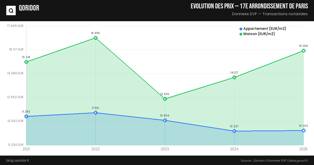 Le prix du m² pour une maison à 17e arrondissement de Paris est estimé à 16 056 € en moyenne (soit +58.8 % par rapport aux appartements). Il peut varier entre 12 619 € et 17 907 € selon la localisation.