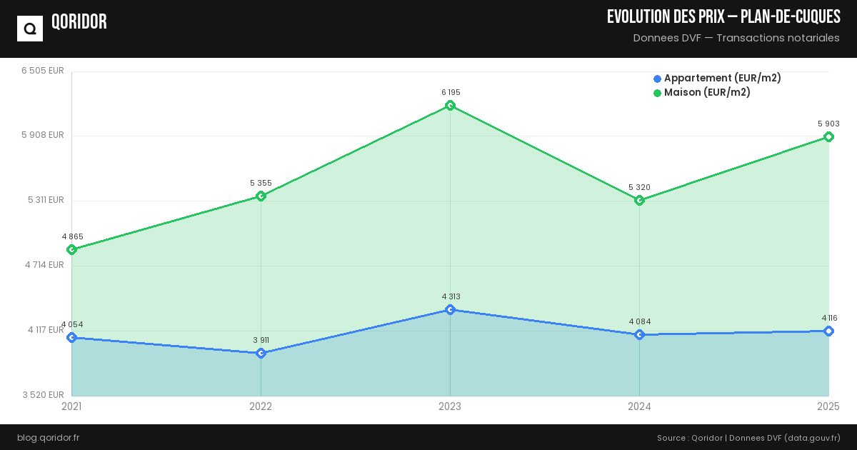 L'évolution des prix à Plan-de-Cuques dépend du quartier, du type de bien et de la conjoncture. Nos données, basées sur les transactions réelles enregistrées par les notaires, vous permettent de suivre les tendances récentes.