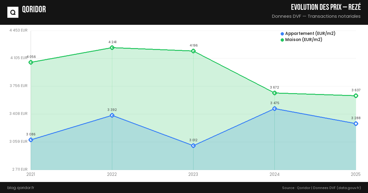 L'évolution des prix à Rezé dépend du quartier, du type de bien et de la conjoncture. Nos données, basées sur les transactions réelles enregistrées par les notaires, vous permettent de suivre les tendances récentes.