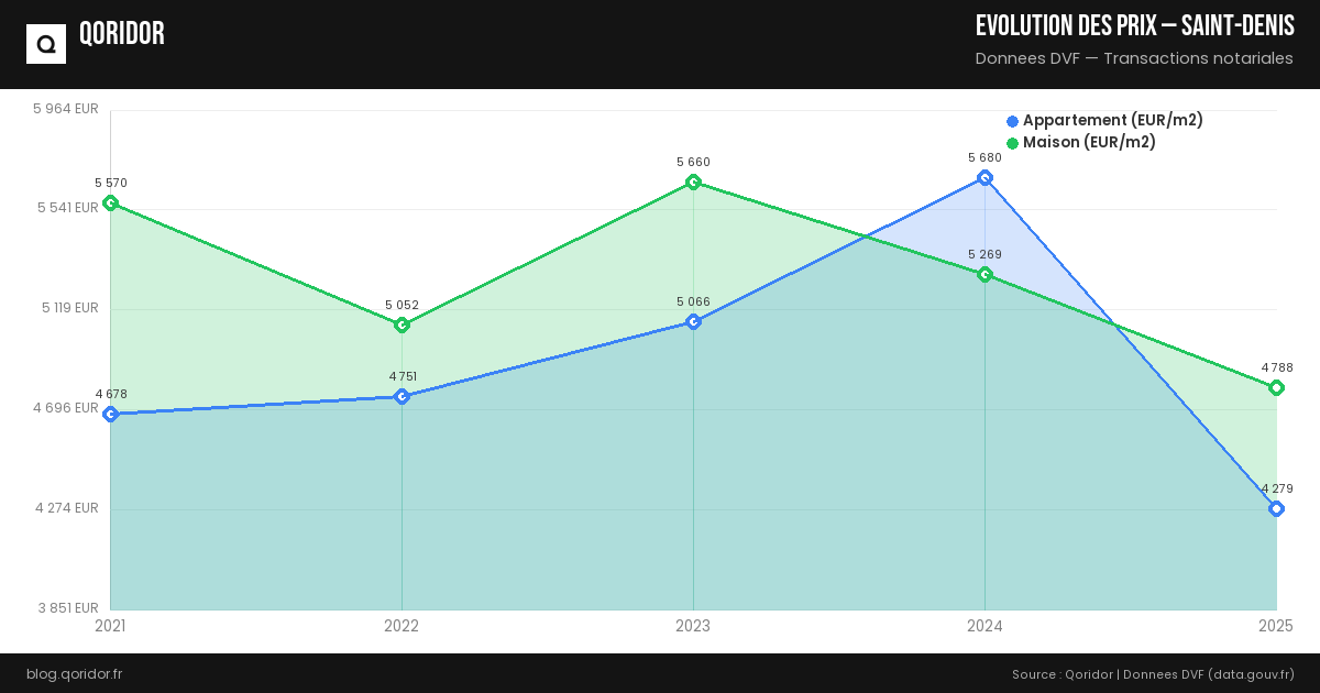 L'évolution des prix à Saint-Denis dépend du quartier, du type de bien et de la conjoncture. Nos données, basées sur les transactions réelles enregistrées par les notaires, vous permettent de suivre les tendances récentes.