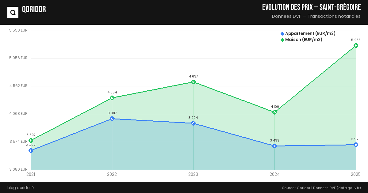 L'évolution des prix à Saint-Grégoire dépend du quartier, du type de bien et de la conjoncture. Nos données, basées sur les transactions réelles enregistrées par les notaires, vous permettent de suivre les tendances récentes.