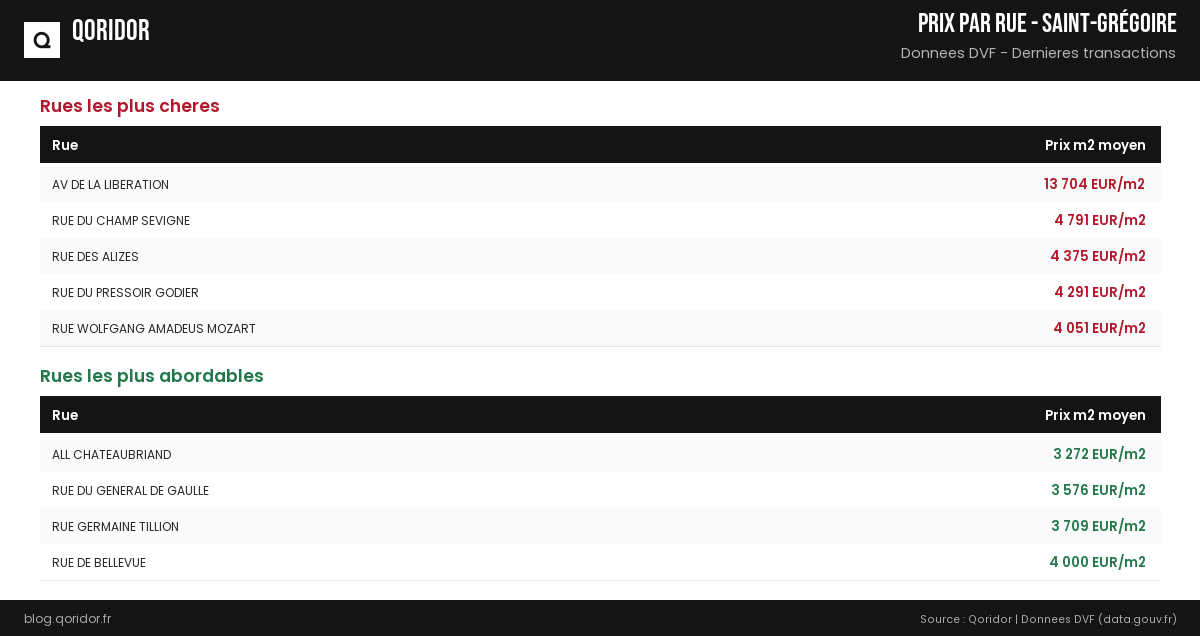 Prix au m² par rue à Saint-Grégoire