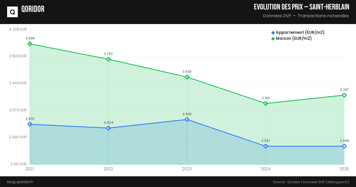L'évolution des prix à Saint-Herblain dépend du quartier, du type de bien et de la conjoncture. Nos données, basées sur les transactions réelles enregistrées par les notaires, vous permettent de suivre les tendances récentes.