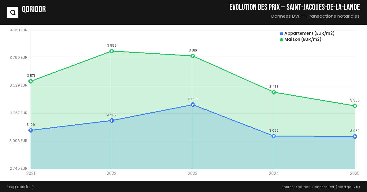 L'évolution des prix à Saint-Jacques-de-la-Lande dépend du quartier, du type de bien et de la conjoncture. Nos données, basées sur les transactions réelles enregistrées par les notaires, vous permettent de suivre les tendances récentes.