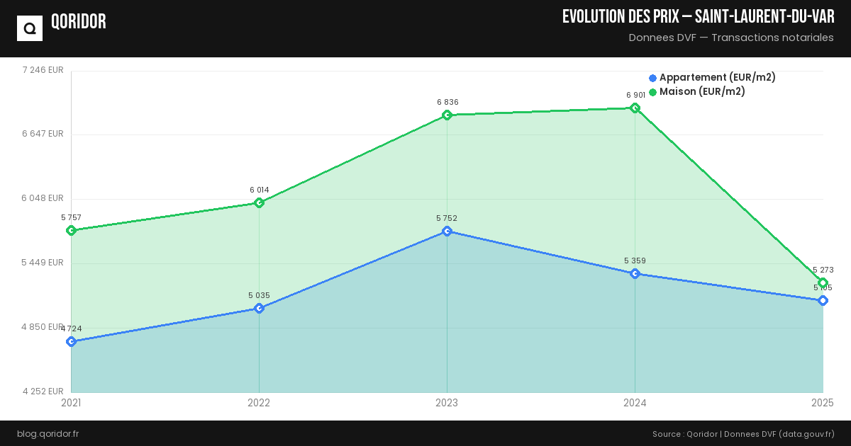L'évolution des prix à Saint-Laurent-du-Var dépend du quartier, du type de bien et de la conjoncture. Nos données, basées sur les transactions réelles enregistrées par les notaires, vous permettent de suivre les tendances récentes.