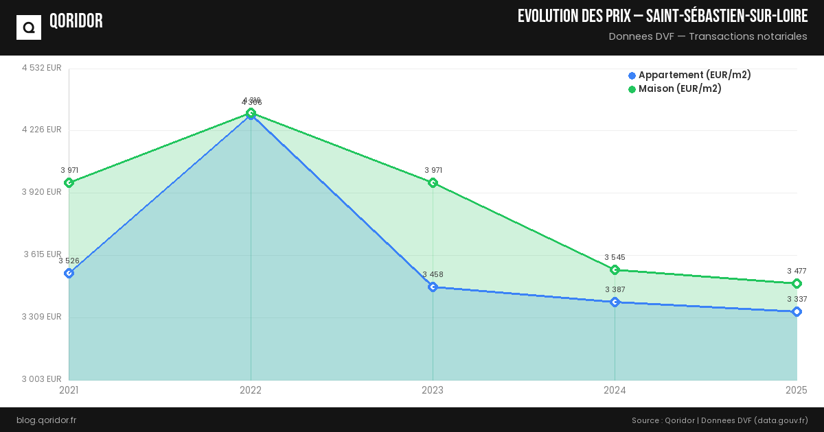 L'évolution des prix à Saint-Sébastien-sur-Loire dépend du quartier, du type de bien et de la conjoncture. Nos données, basées sur les transactions réelles enregistrées par les notaires, vous permettent de suivre les tendances récentes.