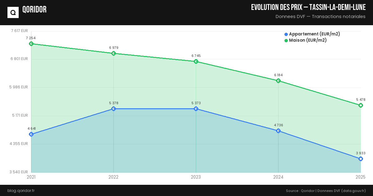 Le prix moyen au m² à Tassin-la-Demi-Lune est supérieur à la moyenne métropolitaine. La commune séduit par son cadre de vie résidentiel, son centre-ville commerçant et sa proximité avec Lyon 5e et le tunnel de Fourvière.