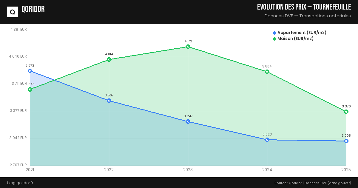 L'évolution des prix à Tournefeuille dépend du quartier, du type de bien et de la conjoncture. Nos données, basées sur les transactions réelles enregistrées par les notaires, vous permettent de suivre les tendances récentes.