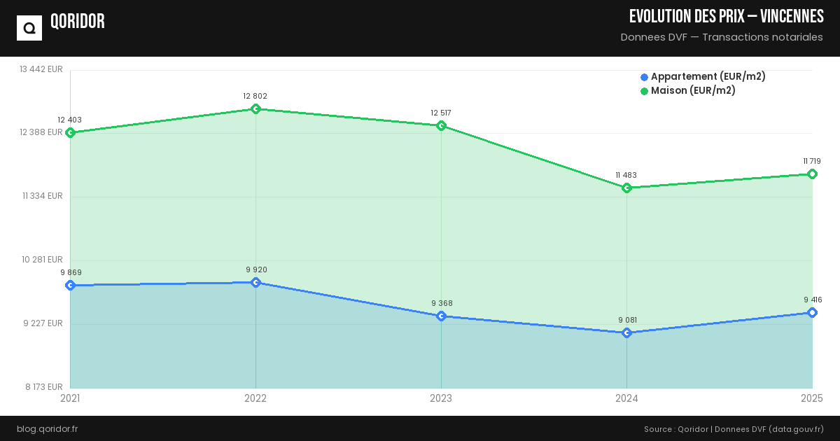L'évolution des prix à Vincennes dépend du quartier, du type de bien et de la conjoncture. Nos données, basées sur les transactions réelles enregistrées par les notaires, vous permettent de suivre les tendances récentes.